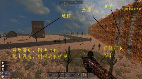 探索周边城镇、废城、矿洞、矿壁(注意13.4中城镇周围必有悬崖,悬崖必有矿石,会在墙上也可能在地上),不用深入,为中后期发展做好准备即可。