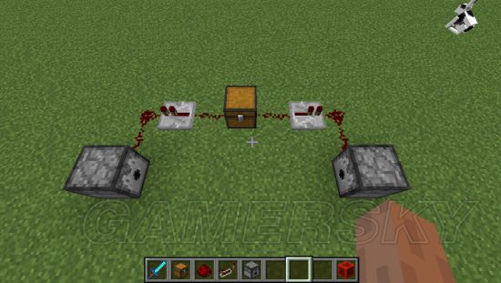 可以清楚的看到箱子打开之后,两侧的红石中继器全部都亮了,说明红石电路被激活。然后退出来,可以看到两个发射器上都插着一直箭: