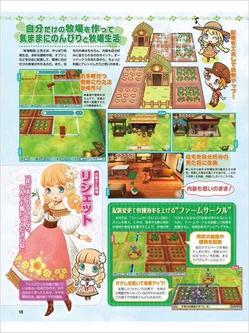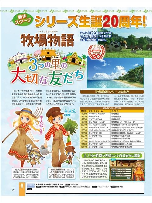 《牧场物语:三个村庄的珍贵朋友》是《牧场物语》系列20周年纪念作,游戏预计将于2016年初夏登陆3DS平台,其售价为5378日元(含税)。本期杂志为大家介绍了本作的主人公及牧场周围三个村庄的简介,此外还有牧场生活的各种要素以及登场人物等等,下面就带领玩家们一起来看一看。