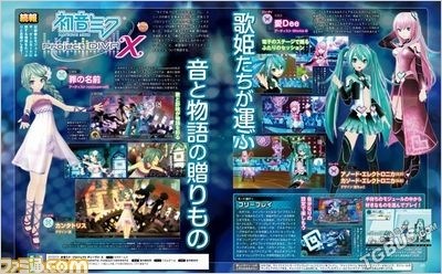 PS4/PSV平台游戏《初音未来 歌姬计划X》PSV/PS4本周FAMI通杂志预览图,介绍了本作的OP曲《罪の名前》(作者:ryo(supercell))及《愛Dee》(作者:Mitchie M)等收录曲及造型。此外还有“自由游玩模式”与本作中