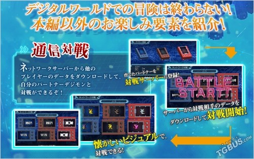游戏中可以从网络服务器上下载到其他玩家的资料,来让其与自己的搭档数码宝贝对战。