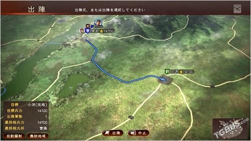 选择出阵指令就可以发起战斗。之后要选择进军路线,如果路上有敌军或是障碍要设法清除或绕过。而在部队编制当中,每个部队长可以配备两名副将,部队可选的士兵种类也非常丰富。当在大地图上遭遇敌军或是敌方据点时就会转入战斗场景,根据地形有可能出现水战或是攻城战等情况。
