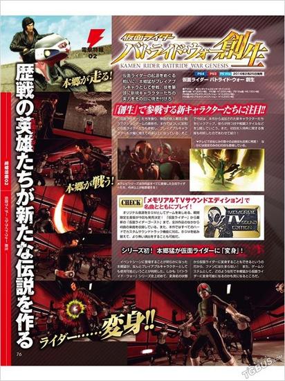 预定于2016年2月25日发售的PS3/PS4/PSV动作游戏《假面骑士:斗骑大战 创生》在本周杂志公开最新情报。本作汇集了《假面骑士》系列26部作品总计45人参战,历代假面骑士和最新的假面骑士Ghost都将登陆本作。本次杂志图公开了育成要素、手办收集、超必杀技和究级技入手条件以及三位新参战假面骑士。