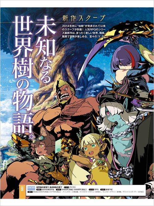 本周Fami通杂志介绍了大量世界树迷宫系列新作《世界树迷宫5:悠久神话的尽头》新信息以及游戏发售日本作于2014年11月发表后一直没有后续情报,连对应平台还未公布。本次正式公开了副标题,也确认游戏将于2016年8月4日发售,售价为6480日元(税拔)。