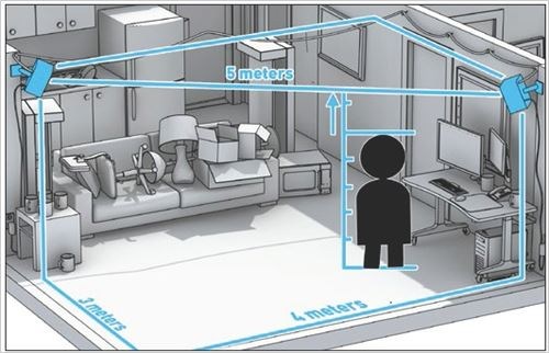Vive的一大卖点就是,在纵横3m x 4m,对角线5m的房间内,能够实时检测出玩家头盔的位置和朝向。用户能够在这个空间里自由地走动。OCULUS RIFT和PS VR虽然能够感知头盔方向和位置,但是因为传感器设置在固定的一个地方,作用范围有限,玩家不能自由活动。基本上,他们是设想用户就在椅子附近活动的。