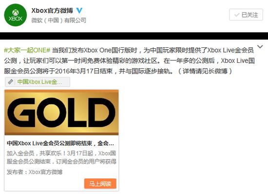 2月25日,Xbox中国官方微博上线 “中国Xbox Live金会员将3月17日开始收费,金会员资格与全球保持一致”公告,宣布国服金会员资格与全球接轨、账号互相打通。