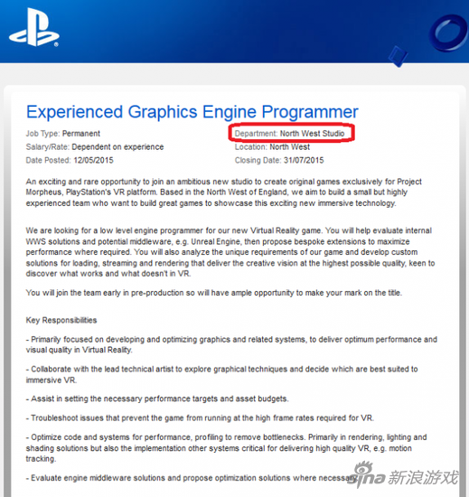 Sony Computer Entertainment (SCE) 已经展开了对Morpheus项目第一阶段的工作。NeoGAF的一个用户发现了西北工作室名下的SCE工作室对经验丰富的图形引擎程序员的工作安排。该工作室总部设在英国,但确切位置尚未证实。如下图所示,该工作室将创建Morpheus项目的“原始”电子游戏。据悉其团队规模很小但很有经验,并将与Epic Games的虚幻引擎技术合作。