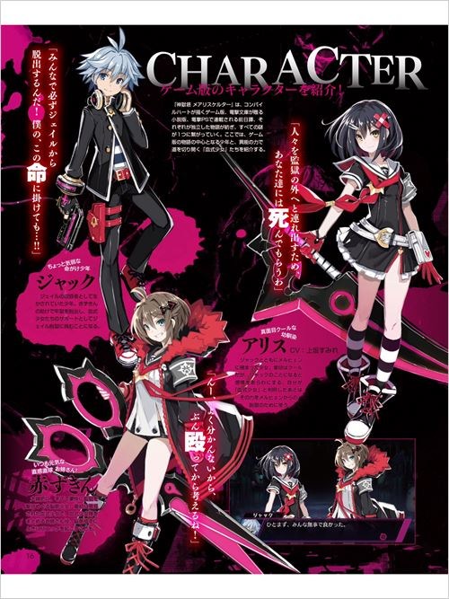 爱丽丝(CV:上坂すみれ):与杰克一起被迷之怪物“童话”捉住的少女,平时虽然很冷酷,但是一旦和杰克有关联就会变得感情用事,明白自己也是“血式少女”以后,决心使用这个力量逃狱。