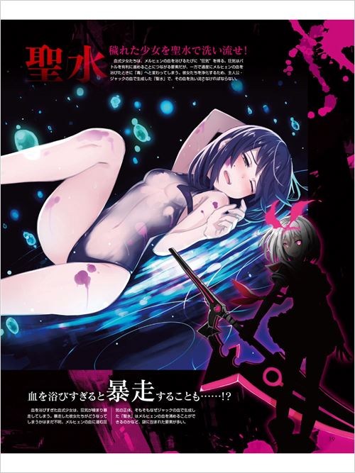 圣水:血式少女们每次被童话的血溅到后就会染上“狂气”,虽然狂气可以使战斗更有利进行,但是过度沾染,童话的血就会变成“毒”,为了净化她们,需要使用主人公杰克的血生成的“圣水”来洗涤。
