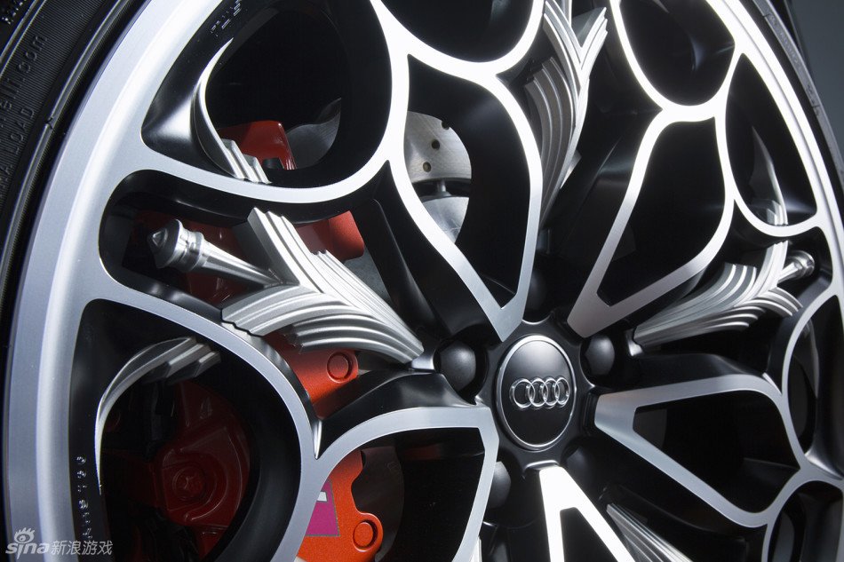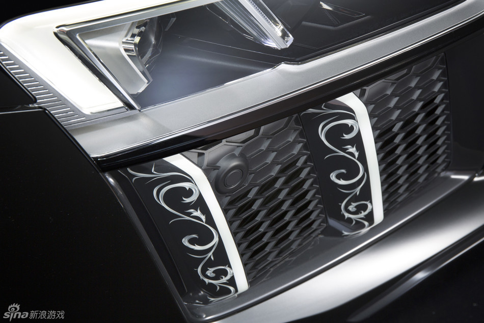 与此同时奥迪官方还公开了一大批FF15版定制R8的高清照(至于是实拍还是渲染,电玩君也有点傻傻分不清楚了)。这辆R8在很多细节方面都与其他版本的R8有所不同,轮毂的造型风格更加华丽,内饰也经过特别定制。