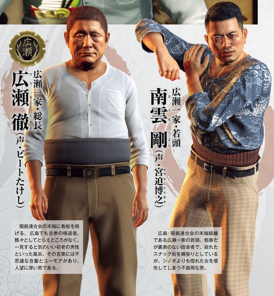 新一期的Fami通杂志公布了PS4新作《如龙6:命之诗(龍が如く6 命の詩)》游戏中的十二位登场人物,有东城会四代目会长桐生一马(出演:黒田崇矢)及桐生最爱的人泽村遥(出演:钉宫理惠),有广岛黑道组织“阳铭联合会”下属“广濑一家”的总长广濑徹 (出演:北野武)、若头南云刚(出演:宫迫博之)以及若众宇佐美勇太(出演:藤原龙也),还有东城会直属组织“染谷一家”的总长染谷巧(出演:小栗旬)、东城会下属真岛组的组长真岛吾朗以及东城会六代目会长堂岛大吾(出演:德重聪)。