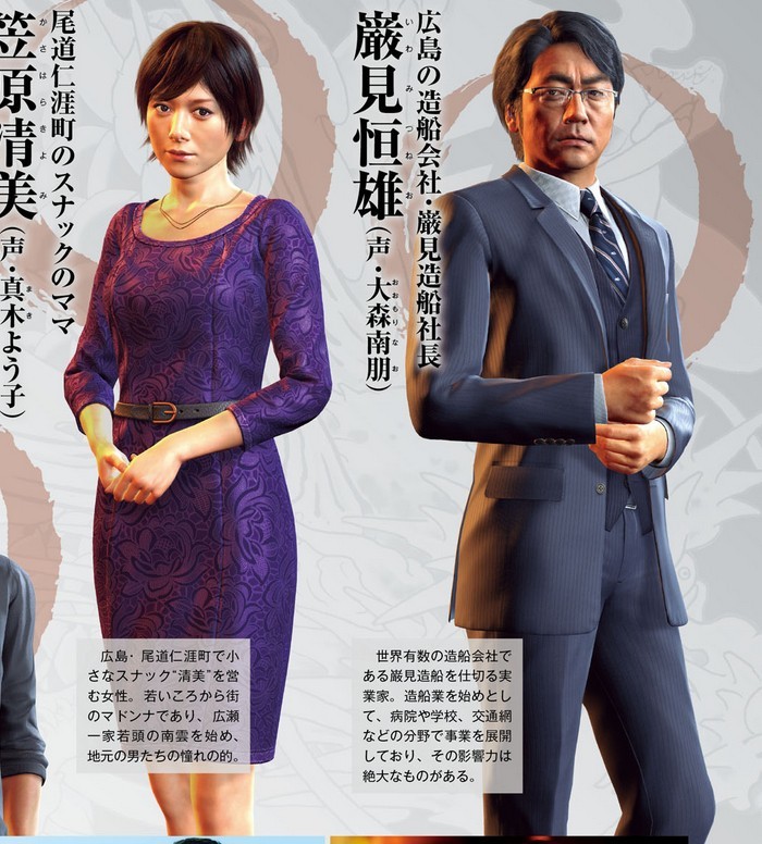 此外,游戏中的出场人物还有广岛尾道仁涯町一家小酒吧的老板娘笠原清美(出演:真木洋子)、广岛“严见造船厂”的社长严见恒雄(出演:大森南鹏)、神室町地下钱庄“天空金融”和夜店“爱丽丝”的主人秋山骏(出演:山寺宏一)以及桐生好友伊达真(出演:山路和弘)和真岛吾朗的结拜兄弟冴岛大河(出演:小山力也)。