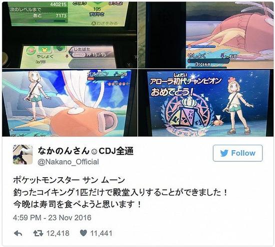 随着系列最新作《口袋妖怪 日月》的发售,不少玩家已经将这款游戏通关。不过一位日本玩家通关的方式略特别:他使用游戏中最弱的精灵鲤鱼王打通了游戏,而且坚持没有将鲤鱼王进化为暴鲤龙。