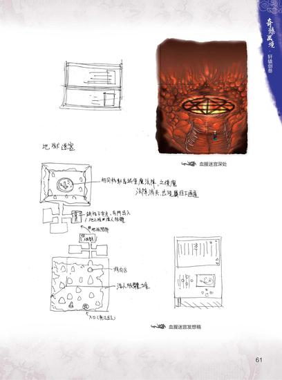比如《轩辕剑叁》出现的血腥迷宫这个场景,在最终成型的画面中我们可以看出这是个恐怖诡秘之地,充满了暗藏的危险与死亡的气息。但在发想稿中,我们可以了解到更多的细节,比如只进不能出的入口、活人肢体堆、烤肉区及地板陷阱。还有有门可以出入的铁格子牢房,地上堆着活人的肢体,和相同移动的城堡魔法阵,魔法消失则会出现地下通道。