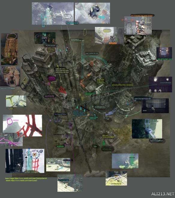 《最后的守护者(The Last Guardian)》的主要剧情内容发生在一个非常神秘高耸的神庙中。但在游戏中玩家和大鹫在这段冒险中,其实很难从整体上看到整张地图的场景设定。不过,近日国外Reddit论坛上的一名大神级玩家,根据游戏中的设定为我们还原了一张整座巨型神庙的全景图。