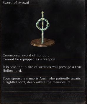 提供商品:余火,神圣的祝福,隐蔽的祝福,锈斑硬币,斯派利耶夫巨剑(原名splitleaf greatsword 应该是DLC里的新武器)