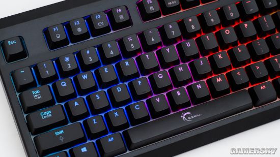 每颗轴体均是透明轴盖,正上方印有可口的樱桃logo,芝奇KM570 RGB无疑采用原装正品的德国Cherry MX RGB机械开关,拥有高达5000万次的敲击寿命,而手感依然如初,内部是贴片式LED灯技术,支持1680万色背光可自定义,亮度可能不如插灯结构,但光源透射更均匀,加上白色钢板的反射作用进一步增加透光面积,无论是机械手感还是背光效果,Cherry MX RGB都是现今最优秀的机械轴体。