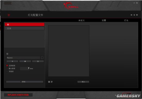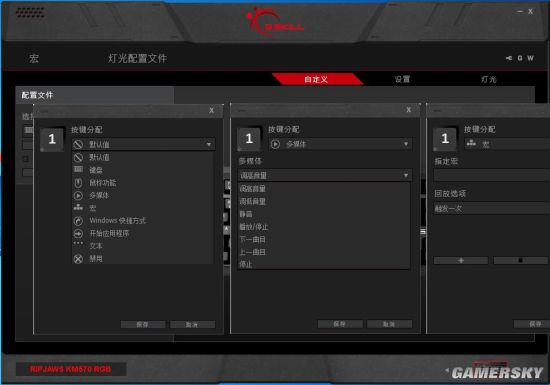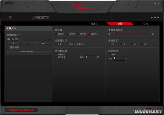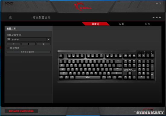 界面分为三个区域,顶部导航栏,左边是宏和灯光的细节设置,右边三个logo是软件设置、官网和PDF保修文档,然后左侧栏是配置文件,KM570 RGB板载内存,因此键盘本身可保存各种按键和背光设定,即使连到新电脑也不用重新安装驱动,主界面右侧是KM570 RGB机械键盘的渲染图,可对图中按键进行自定义和灯光设置等。