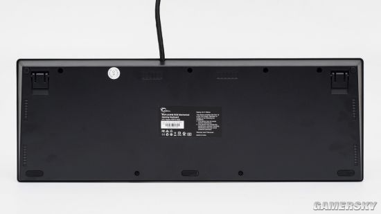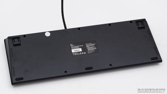 翻开背面,常规的双支撑脚架和四颗防滑橡胶布局,中间是铭牌标签和SN信息,防滑橡胶的面积偏小,尤其上方两颗圆形脚垫,脚架上也没有提供防滑支持,所以总的防滑能力一般般,好在日常使用键盘还算稳定,毕竟有1.25kg重量。