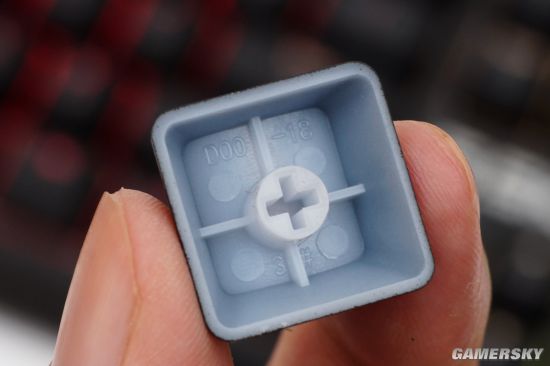 键帽特写,不出意外芝奇KM570 RGB搭配了背光键盘经常使用的ABS透光涂层工艺键帽,表面类肤质手感,做工细腻,摸上去特别柔滑舒服,底边干净无毛边,内部是四向加强筋。说到ABS键帽大家往往先想到它的缺点,不耐磨损、容易打油等体质,却忽视了优点一面,比如做工精致,可制作出复杂的字符和图案,相比之下现在流行的PBT二色字透键帽虽然耐磨性能好,但由于受到工艺限制,字符不能闭口,不如ABS键帽观感好,猜测这也是高端RGB机械键盘依然坚持传统ABS字透键帽的原因。反正两个键帽阵营各有优缺点,要字符好看选ABS字透,要耐用选PBT字透。