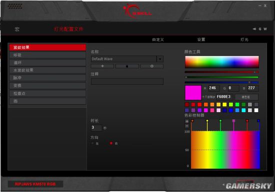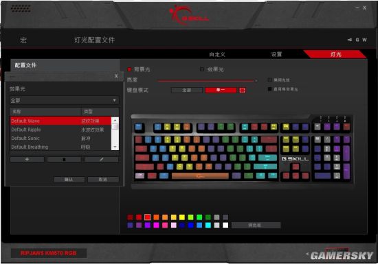 下面是驱动的重头戏部分,灯光设置,主要分为两种模式,一种是背景光,可手动选择全部或单颗按键的背光颜色,有调色盘,也支持RGB三原色数值或16进制的设置,另一种是效果光,就是芝奇预设的动态灯效,有波纹、水波纹、呼吸、循环、脉冲、变化、检查点、雨点8种模式,在灯光配置界面中可对以上模式进行更加详细的编辑。