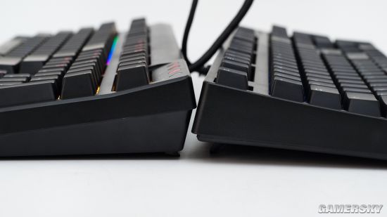 键盘作为输入工具,普遍采用前高后低的设计,形成的弧度可以使人手自然向下,舒缓手与前臂造成的压力,人体工学键帽也是同样的原理。机械键盘由于结构关系,总体比薄膜键盘高出一截,而芝奇KM570 RGB的高度设定更为激进些,顶壳默认高度40mm,比大多数机械键盘高5mm左右,或者说接近其他机械键盘打开脚架后的高度,强推了一波人体工学的输入角度。
