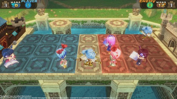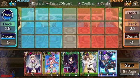 首先是战场的设定,乍看之下和《皇室战争》有几分相似之处,只是利用回合制代替了《皇室战争》的即时制,战场也变成了横向。游戏的对战在7×3的方格上展开。玩家只能在代表己方的3×3的方格上放置自己的卡牌,双方的场地中间有一个空闲地带。玩家在放置了卡牌后,召唤出对应的魔物(游戏中的卡牌立绘全是魔物的萌化妹子版)在下一回合时会向前走一格,玩家需要利用利用这些势力攻向对面的城堡,最终取得胜利。