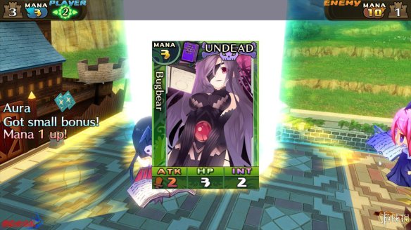 让笔者感觉有还算有趣的是相同种族(不是之前提到的类别)卡牌的融合,虽然效果只是单纯的数字叠加,但是为整个战斗增加了一些变数。还有一点是玩家在连续打出三张相同边框(如下图中的绿色边框)的卡牌后,可以触发一个群体buff,给己方场上的卡牌增加伤害、HP,恢复魔力。
