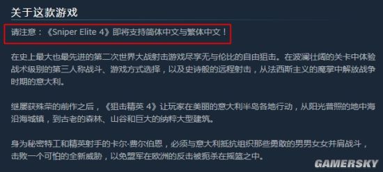 近日,《狙击精英4》在Steam页面的游戏介绍一栏,赫然出现了“请注意:《狙击精英4》即将支持简体中文与繁体中文!”的开头。看来国区玩家期待已久的官方中文即将来临了。