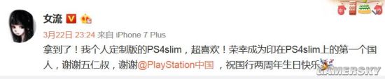 近来受到玩家热议的清华女主播女流,参加了本次活动并获赠一台“个人定制版”PS4 Slim,她应该是被印在PS4主机上的第一位国人了,女流在微博发文称“超喜欢!”,并且“谢谢五仁叔,谢谢PlayStation中国 ,祝国行两周年生日快乐”。