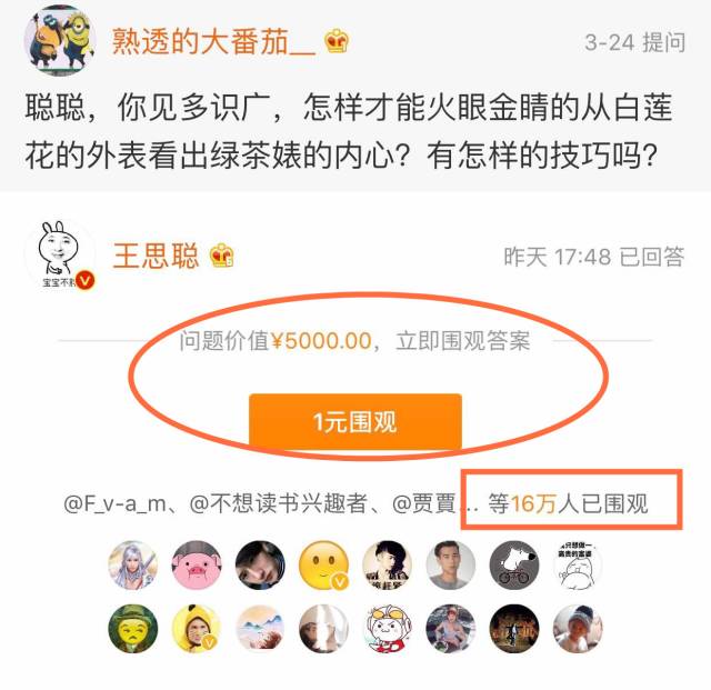 近日,有网友在网上提问国民老公王思聪,问他怎样看穿绿茶婊的内心。这个深奥的问题获得了极大的关注,原本一条价值5千元的问题,最后,问问题的人收到了10万+以上的围观费。