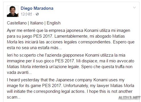 今日早些时候,著名的足球运动员马拉多纳在自己的脸书账号上用包括英语在内的三种语言发表声明,要针对科乐美(Konami)公司采取法律手段。