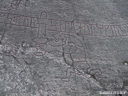 瑞典的古代石画 – 齐格鲁德手持Gram斩杀巨龙(来源未知)