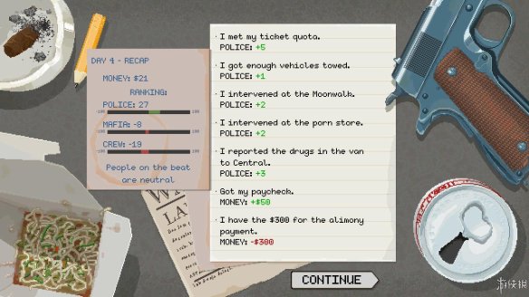 前面也提到了路人每天都会向你提出各种奇怪的请求,那么自然就轮到玩家来选择是否要帮助他们完成任务。在游戏内是选择做一个好警察还是坏警察全部都看玩家自己。游戏内有一个重要的数值就是和黑白两道的声望关系,在结束了每天的工作后就会统计声望值的变化。当声望关系变化后,游戏内日常的随机任务也会随之改变。这点是笔者认为这款游戏的精华所在,也大大的增加了游戏的可玩性!听说游戏内有多达20种结局,玩家在尝试过当好警察后也可以体验下做坏警察的感觉!