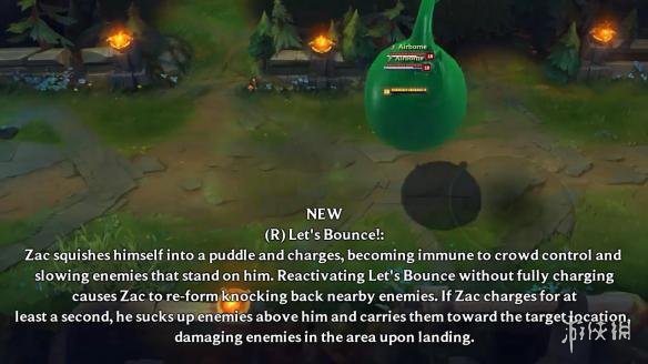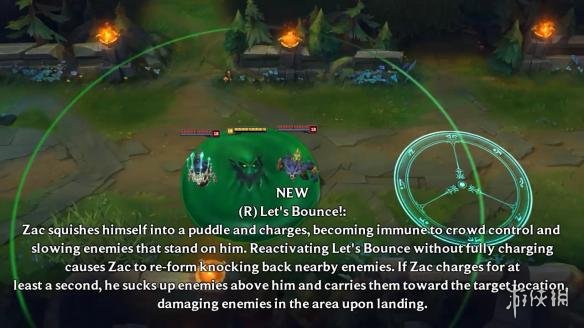 而新版的R技能大招则更加有趣,扎克会将自己沉入地面之中,短暂蓄力后会将身体范围内的敌方英雄“兜住”一同弹跳向指定位置。