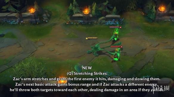 生化魔人-扎克的Q技能现在是将自己的弹性手臂投掷到某一方向,命中一个敌方英雄后会暂时保持连接状态。再次释放另一支手臂命中另一名敌人后会将两名敌人拖拽碰撞到一起产生短时间的控制效果。