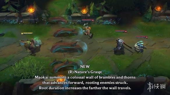 扭曲树精-茂凯现在的R技能是向前推进几捆同时前进的树根,遇到第一个敌方英雄后会将其禁锢,看起来和娜美的大招十分相似。