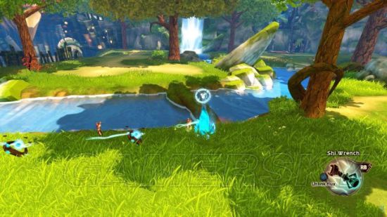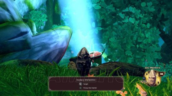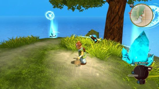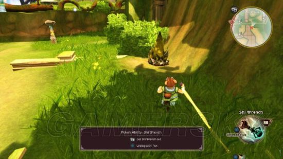 step4.走上山坡,按Q键拿出Poky的气扳手,从水晶中取出气,将气引到草丛中带有石块的树枝上,那么这种树枝会作为气的转接点,再从树枝上取得气将其引导到一个缺乏光泽的水晶中。