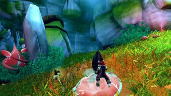 在河口区域入口前,有树藤阻挡,切换为Chado,将石碑扔到左上方的红蘑菇上。