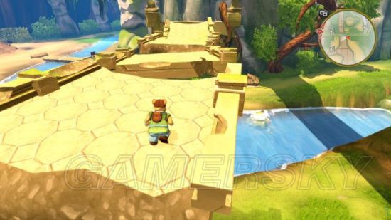去到出海口的河流旁边找到气水晶,让Poky连接它们,就可以升起河中的桥梁。