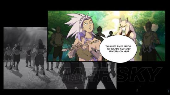剧情:Chado他们回到营地当中,此时Irys试图吹笛子吸引Mantara出现,可是它却未能及时出现,而小精灵Terra察觉到这地区有黑暗的气阻隔着lrys的笛声。