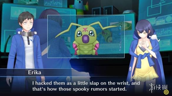 两位妹子分别是和男主角同一组织的御岛Erika和另一个组织Zaxon的菲。御岛Erika在一次事故中觉醒了天才的骇客技术,非常怕生害羞,不太和人接触,长期闭门不出,同哥哥住在一起,数码兽同伴是虫虫兽,它非常胆小,在被Erika所救之后就一直跟着她,是组织的吉祥物,怯懦、笨手笨脚、爱惹事又充满好奇的可爱小家伙,两位将经常在游戏中作为主角进行战斗。