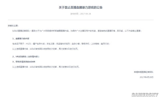 B站在公告中表示,为保护广大主播及用户的利益,塑造绿色的直播环境,即日起,以下内容禁止直播:血腥暴力的内容,包含且不限于:H1Z1;僵尸生存大战;求生之路;侠盗猎车手系列;血染小镇;黎明杀机;上古卷轴;幽灵行动。