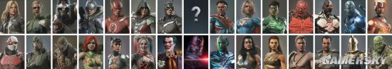 《不义联盟2》公布的角色包括蝙蝠侠,神奇女侠,超人,海王,绿灯侠哈尔乔丹,闪电侠,绿箭,钢骨,猫女,哈莉,毒藤女,黑金丝雀,贝恩,豹女,小丑,沼泽怪物,达米安韦恩,Doctor Fate,红灯阿托希塔斯,火风暴,蓝甲虫,稻草人,猩猩格鲁德,超女,布莱尼亚克。通过战甲登场的角色包括Powergirl,Zoom。约翰斯图尔特。其他通过场景击杀的客串角色包括黑蝠鲼,鳄鱼人。通过DLC加入的角色包括达克赛德。