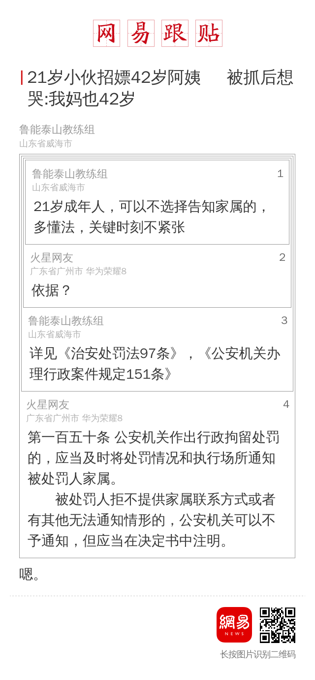 故事发展到这只是一次普普通通的扫黄。警察调查发现,小刘今年才21,失足女已经42岁了。知道这个事小刘当时就很想哭,“啥,她42岁?我妈也42岁……”