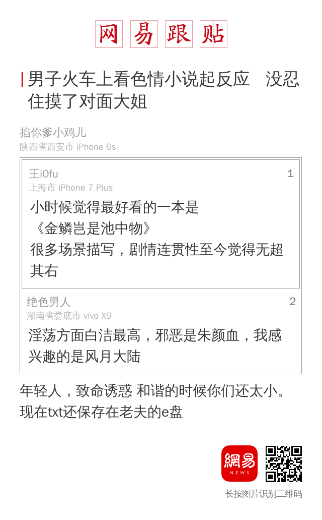 又有一个小伙,姓程,今年23岁,温州人士,去山西出差。在火车卧铺睡觉前一直在看色情小说,看得抓心挠腮的,凌晨醒来,发现对面铺位躺着一位大姐,看着格外眉清目秀,胸部正好对着小程,一个没忍住摸了人家胸,被当场抓包。