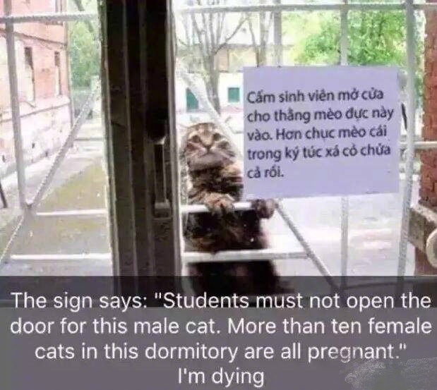 在越南一间宿舍门口,有一天突然贴上一张告示说,不准帮这只公猫开门,因为宿舍里有超过10只母猫被它搞怀孕了。
