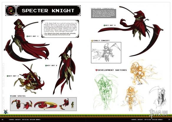 《铲子骑士:官方艺术设定集》将会包含游戏角色的艺术设定图,开发者的评注、草绘插图、艺术概念图、背景设定图、大量的妖魔鬼怪插图、整页的宣传促销插画,以及对游戏制作团队的独家采访。这本艺术设定集将于今年8月的某个时候发售。喜欢《铲子骑士》的玩家不容错过。