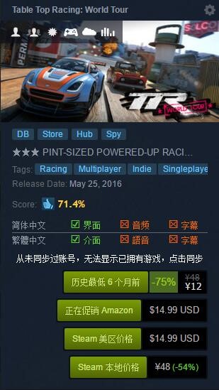 3、《桌面赛车:世界巡回赛(Table Top Racing: World Tour)》一款趣味的赛车游戏!PS:中文游戏。——游戏历史最低12元。现steam国区售价48元。