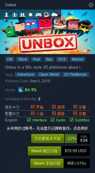 2、《拆箱(Unbox)》——游戏曾经最低的折扣价是34元,在steam国区上,目前任需68元人民币购买。